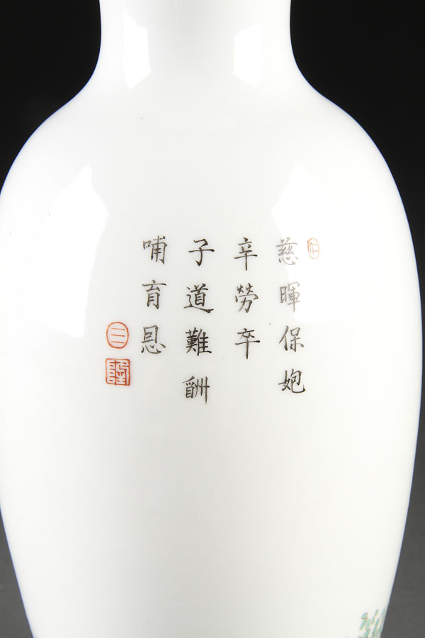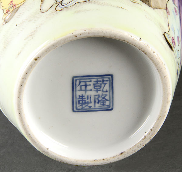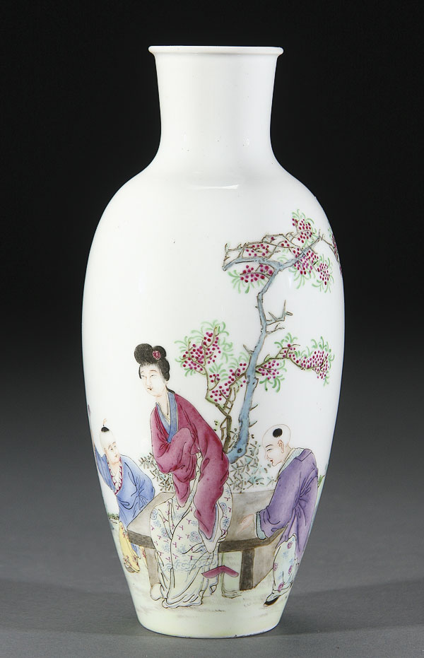 A VERY FINE CHINESE FAMILLE ROSE PORCELAIN "FIGURES" VASE. Of ovoid form with a finely enameled scene of a young beauty and attendants below a fruit tree. The verso with calligraphy inscription. Marked on base with raised blue enameled Qianlong seal mark in cartouche. Height 9 inches (23 cm).