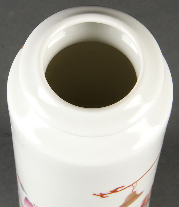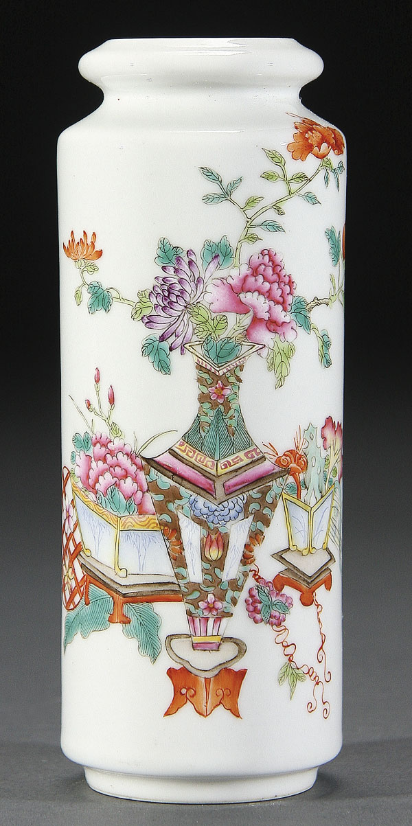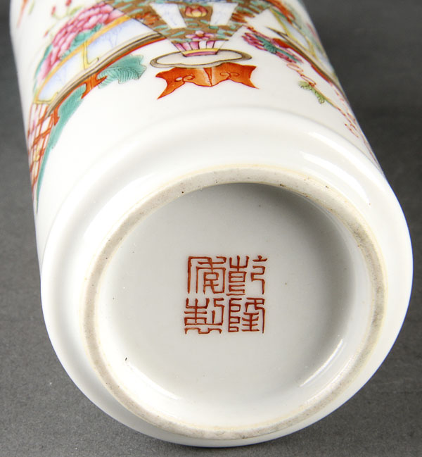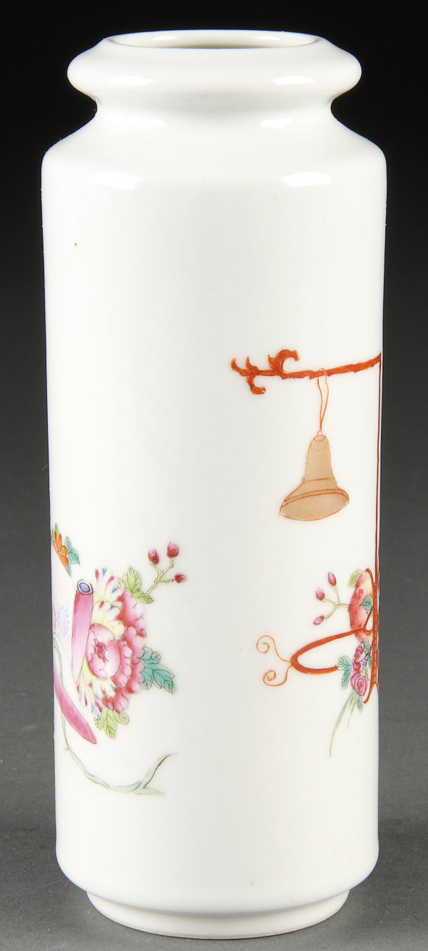 A CHINESE FAMILLE ROSE PORCELAIN CYLINDER VASE. Finely enameled with floral blossoms and Buddhist symbols. The base with red Qianlong seal mark. Height 5.5 inches (14 cm).