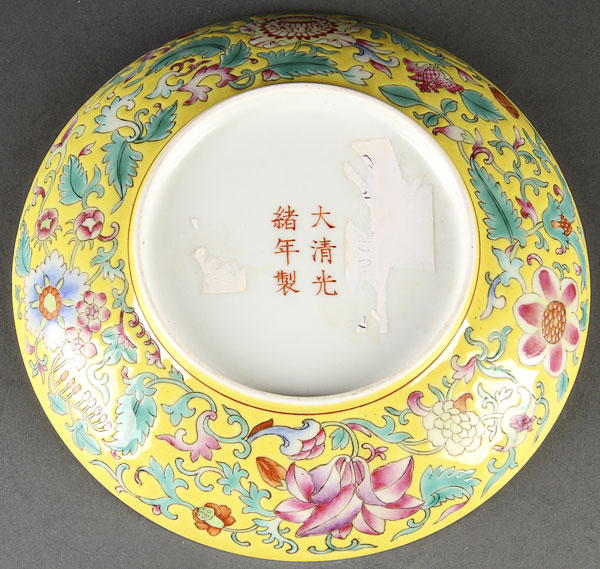 A CHINESE YELLOW GROUND FAMILLE ROSE PORCELAIN LOW BOWL. The interior decorated with five copper red bats, six character red Guangxu reign mark. Diameter 6.725 inches (17 cm).