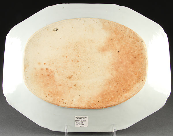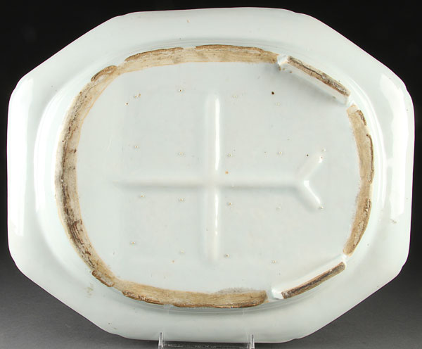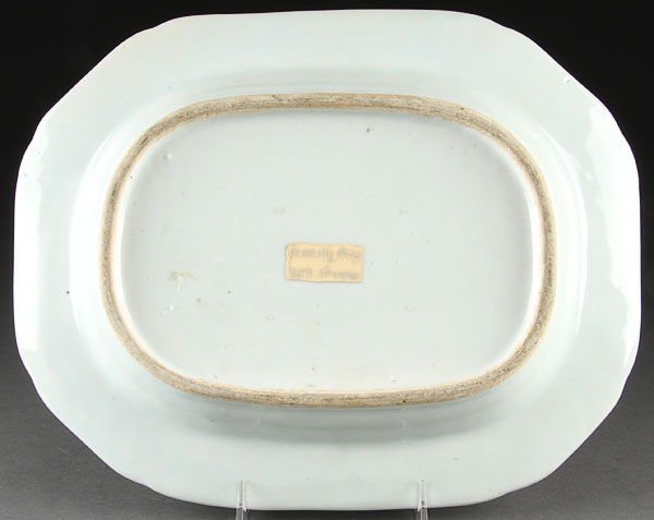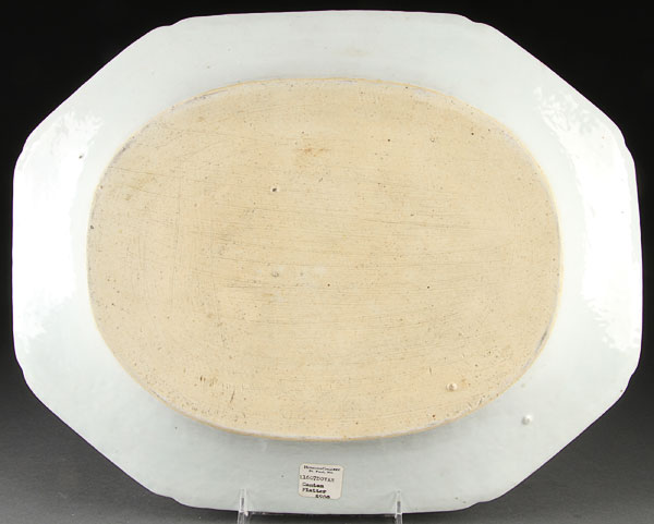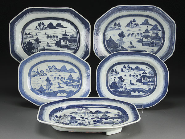 A GROUP OF FIVE CHINESE CANTON EXPORT PORCELAIN PLATTERS, LATE 18TH/EARLY 19TH CENTURY. Of elongated octagonal form wuth blue scenic transfer decoration. The largest 16.5 inches (42cm).