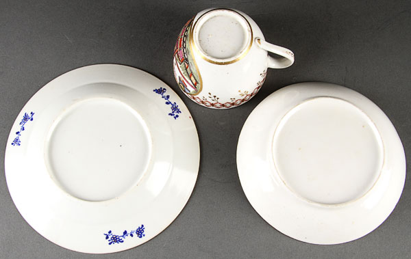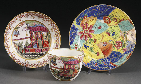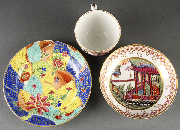 A CHINESE EXPORT PORCELAIN CUP AND SAUCER, LATE 18TH/19TH CENTURY. Finely decorated with overglaze enamels depicting an elaborate court yard canopy, together with a Chinese Export dessert plate with "Tobacco Leaf" variation. The largest diameter 6 inches (15 cm).
