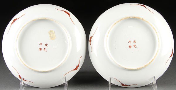 A PAIR OF CHINESE 19TH CENTURY FAMILLE ROSE PORCELAIN "BUTTERFLIES AND FLOWERS" LOW BOWLS. Each decorated with matching overglaze polychrome enamels with four bats on verso, red four character reign mark. Diameter 7.375 inches (18.8 cm).