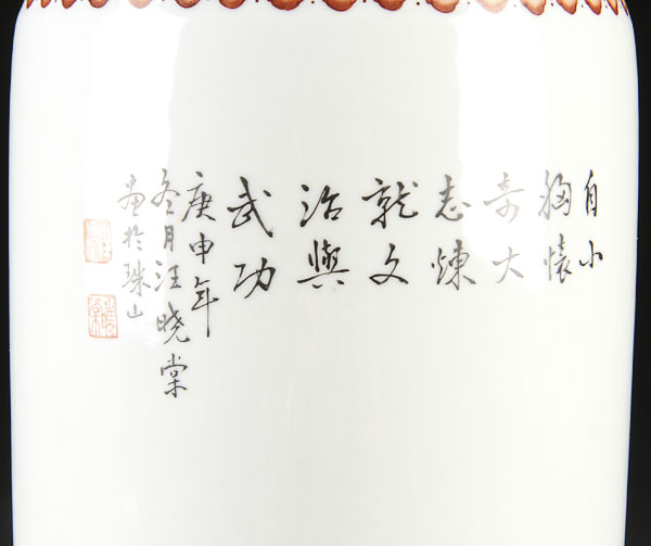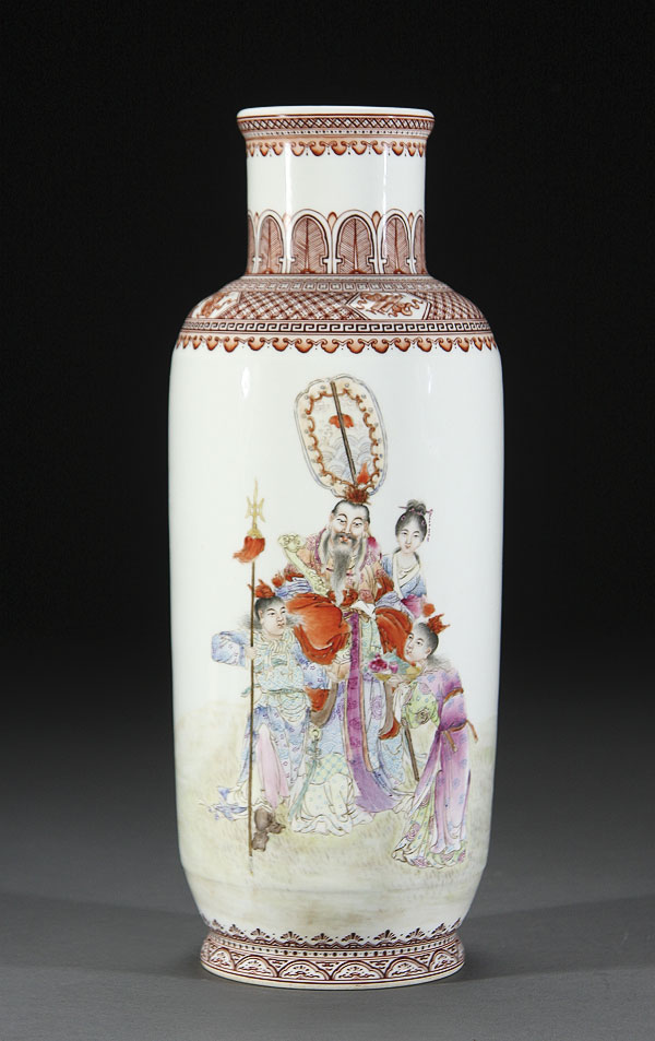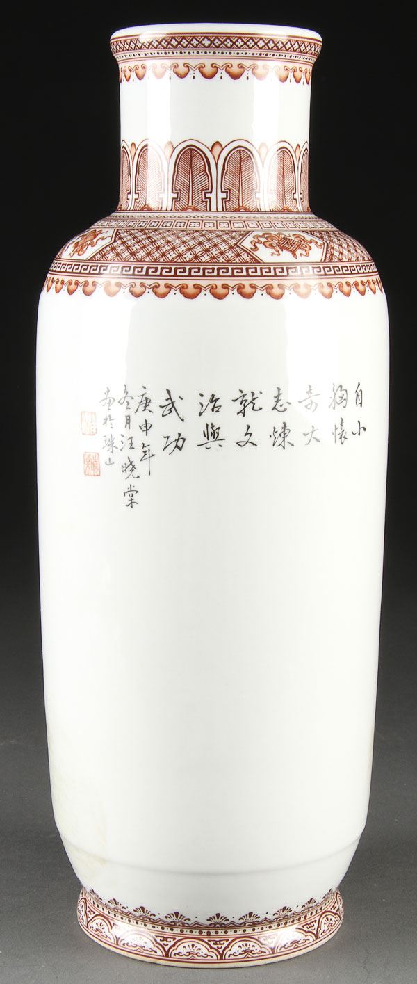 A FINE CHINESE FAMILLE ROSE PORCELAIN "FIGURES" VASE, REPUBLIC PERIOD. Finely painted in great detail with a noble figure and attendants below a Russian style decorated shoulder. The verso with calligraphy inscription. Height 13 inches (33 cm).