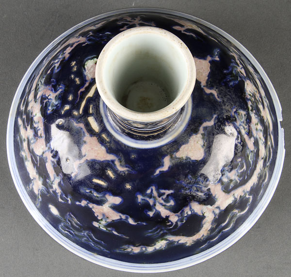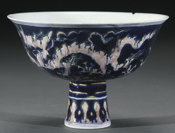 A CHINESE BLUE GLAZED AND PINK SPLASHED PINK PORCELAIN STEMMED BOWL POSSIBLY 17TH CENTURY. Decorated in thick cobalt blue glaze with two dragons and cloud forms, highlighted in pink and green splashes, raised on tapered cylindrical stem, unmarked. Minor loss to rim with hairline. Diameter 6 inches (15 cm), height 4 inches (10 cm).