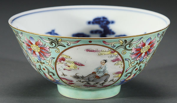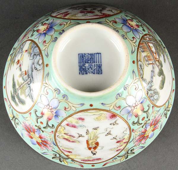 A CHINESE FAMILLE ROSE TURQUOISE GROUND "SCENIC" PORCELAIN BOWL. The exterior finely enameled with floral blossoms and four medallions depicting various scenes and activities. The interior with a blue and white underglaze scene, Daoguang blue seal mark. Diameter 5.75 inches (14.7 cm).