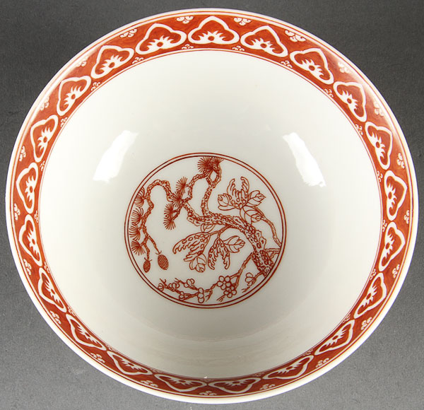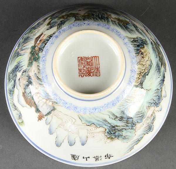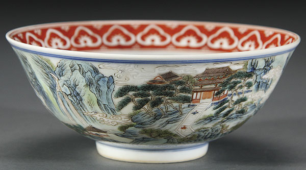 A VERY FINE CHINESE FAMILLE ROSE AND COPPER RED "SCENIC" PORCELAIN BOWL. Finely painted with a mountainous setting of pavilions and waterfalls, the interior with red decorated medallion and border. Red Jiaquing seal mark. Diameter 5.75 inches (14.5 cm).