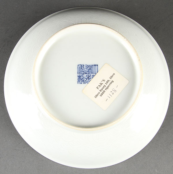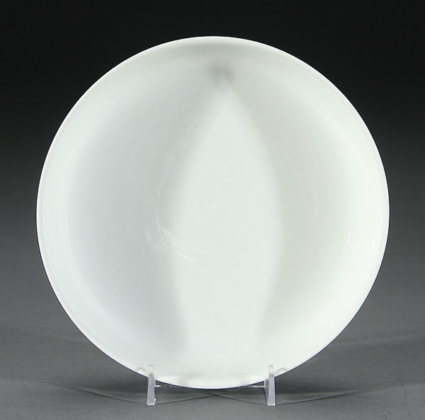 A CHINESE WHITE GLAZED AND INCISED PORCELAIN LOW BOWL. The exterior with repeating stylized wave design incised underglaze, blue underglaze Daoguang seal mark. Diameter 7.5 inches (19 cm).