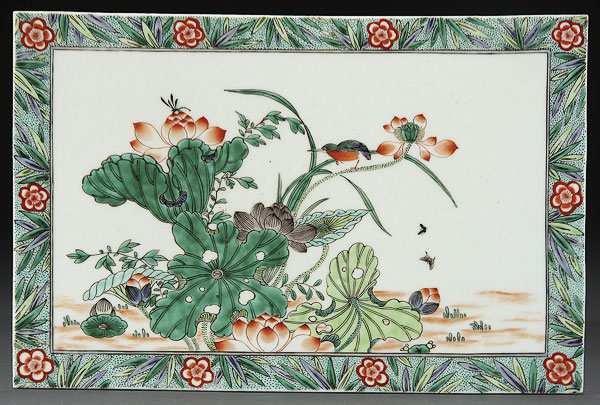 A CHINESE FAMILLE VERTE "LOTUS AND BIRD" PORCELAIN PLAQUE. Of flat rectangular form, decorated with lotus blossoms, bird and butterflies within a floral border, unmarked. 15.25 inches (39 cm) x 10.125 inches (25.5 cm).
