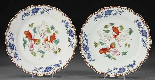A PAIR OF CHINESE EXPORT PORCELAIN PLATES 18TH/19TH CENTURY. Each decorated with five polychrome and copper red gold fish with enameled florals. Diameter 9.25 inches (23.5 cm).