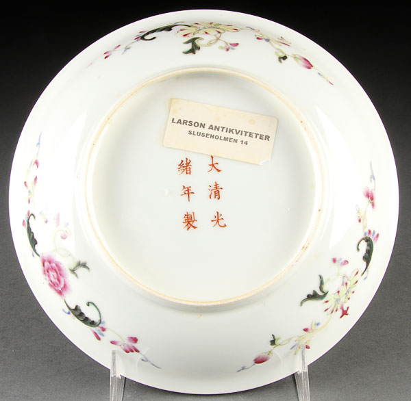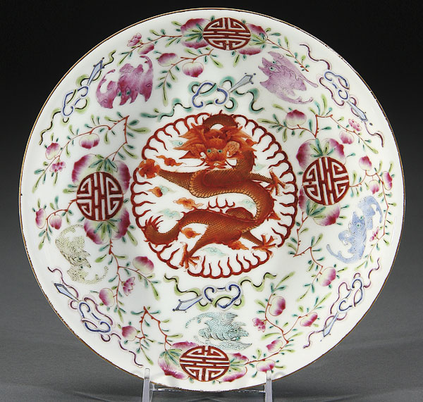 A CHINESE FAMILLE ROSE PORCELAIN "DRAGON AND BATS" LOW BOWL. The interior finely painted with a red and gilt dragon, five bats, peaches and Buddhist symbols, red Guangxu six character reign mark. Diameter 8 inches (20.5 cm).