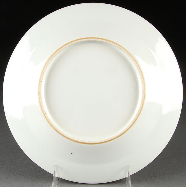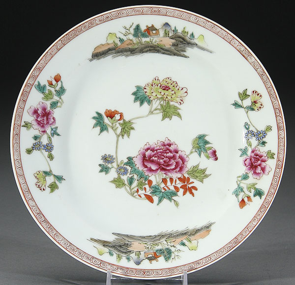 A CHINESE FAMILLE ROSE PORCELAIN PLATE. Enameled with florals and scenic vignettes, unmarked. Diameter 9.25 inches (23.5 cm).