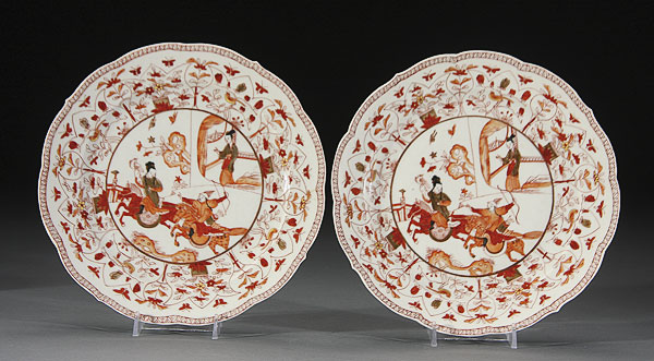 A PAIR OF CHINESE RED DECORATED AND GILT PORCELAIN PLATES. Each with matching decoration of horse mounted archer with attendant barring a falcon, contained within a foliate bird and butterfly border, unmarked. Diameter 9.5 inches (24 cm).