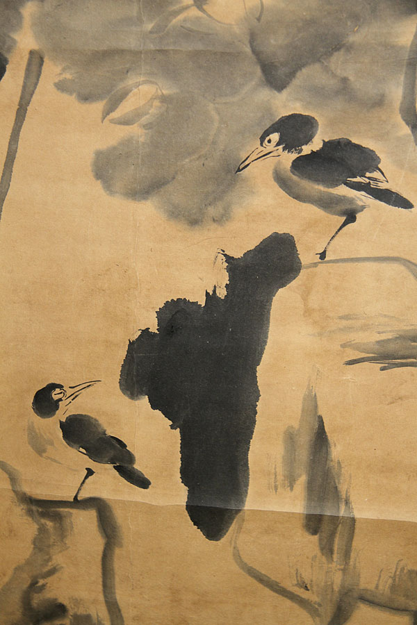 A CHINESE HAND PAINTED SCROLL, QING DYNASTY. Ink on paper, depicting two birds and large floral blossoms, signed upper left. 47.25 inches x 23.5 inches (120 x 60 cm).