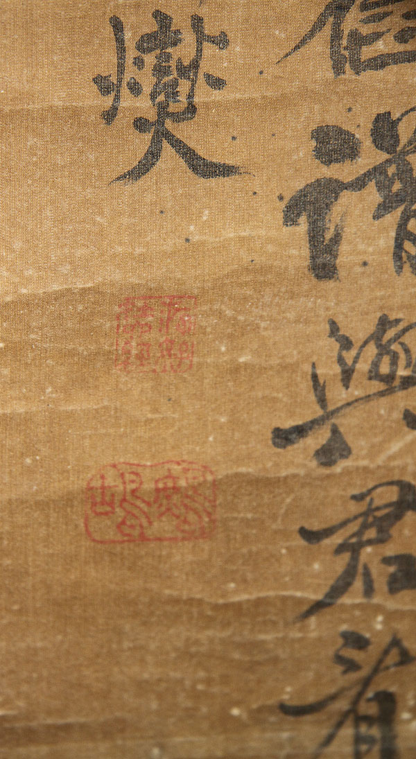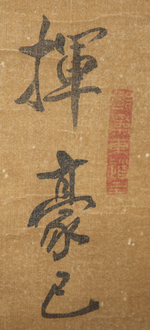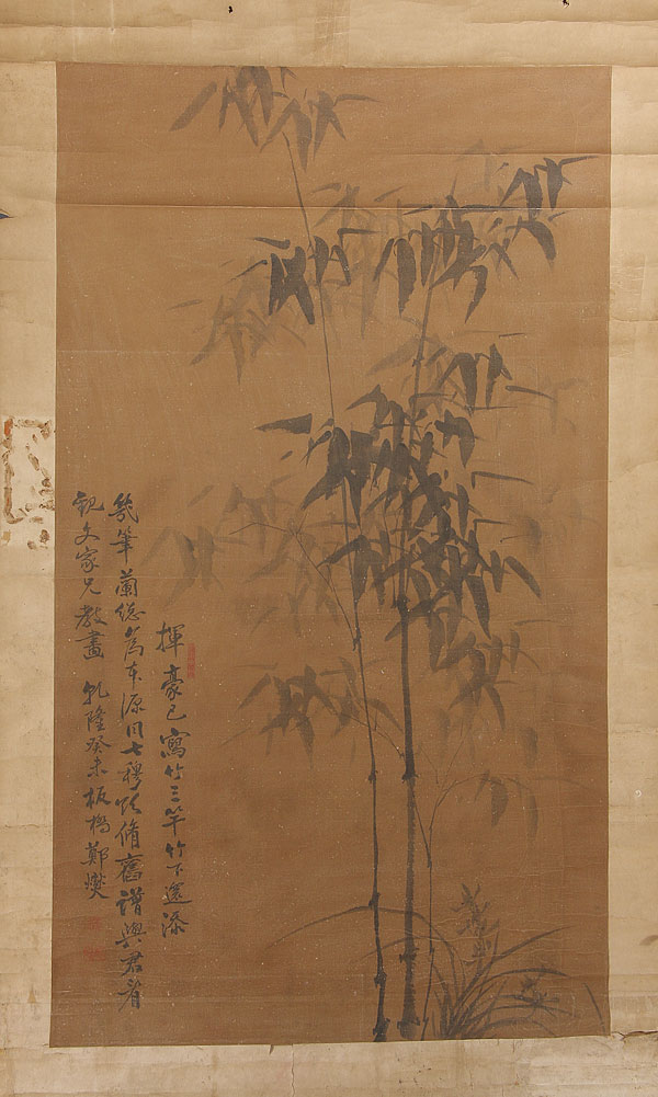 A CHINESE HAND PAINTED SILK SCROLL, QING DYNASTY. Ink on silk, painted with bamboo shoots, signed with inscription upper right. 54 inches x 31 inches (137 x 79 cm).