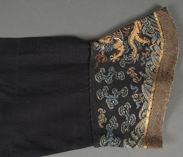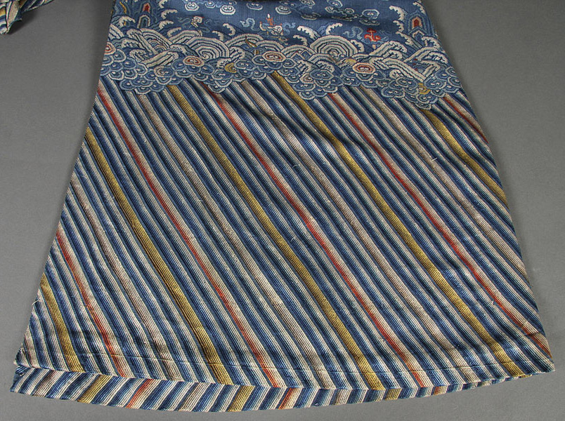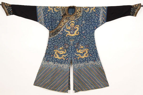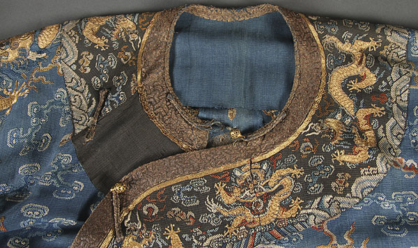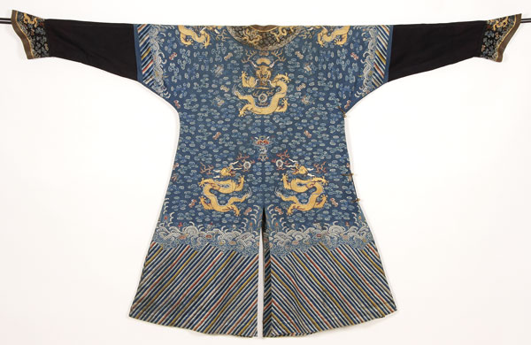 A FINE CHINESE BLUE SUMMER GAUZE FORMAL COURT ROBE OR CHI'FU, QING DYNASTY. Finely embroidered with gilt brocade dragons, cloud forms, auspicious emblems and bats, on blue gauze above a lishui border. The verso with conforming decoration. Length 53 inches (135 cm).