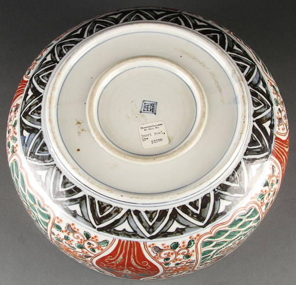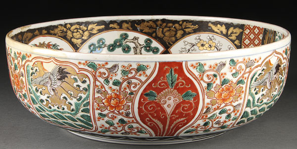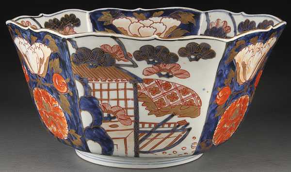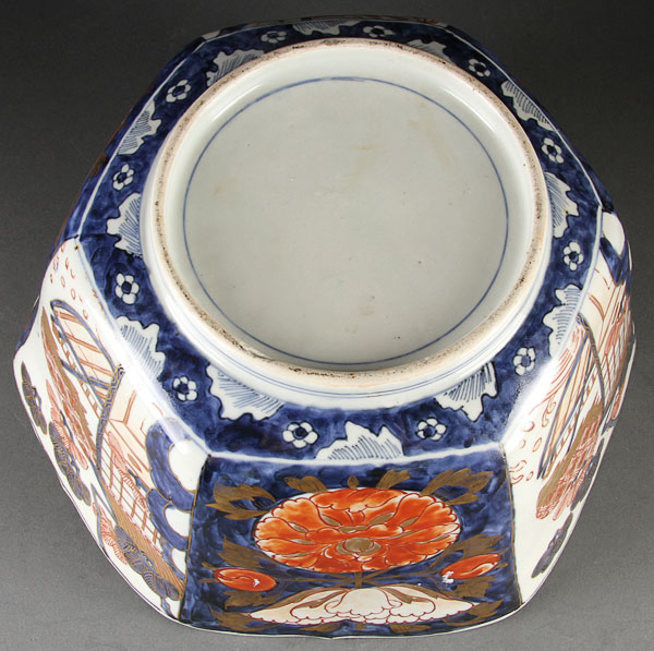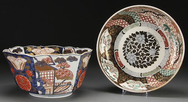 TWO LARGE JAPANESE IMARI BOWLS, MEIJI PERIOD. Comprising a deep sided hexagonal bowl with cobalt copper red and gilt decoration and a Kutani enameled bowl with scenic cartouches marked with Fuku. Diameter 12.25 inches (31 cm), height 6 inches (15 cm), and 4.25 inches (11 cm).