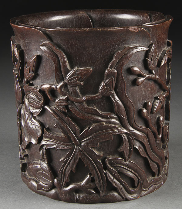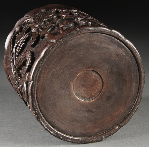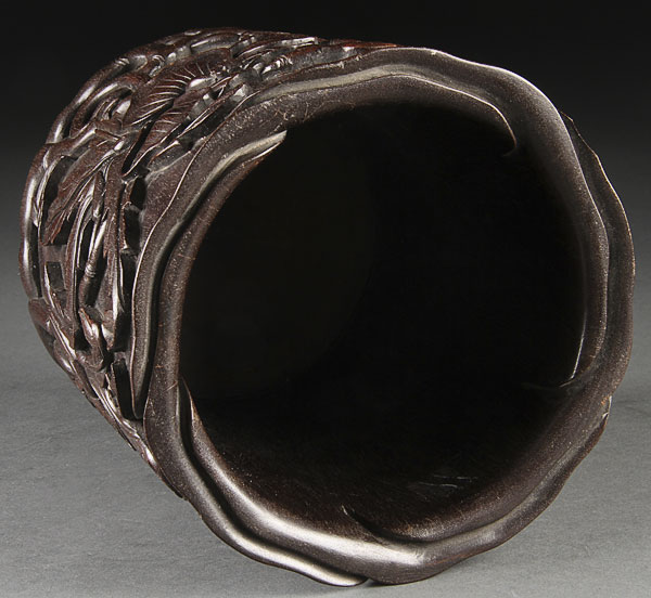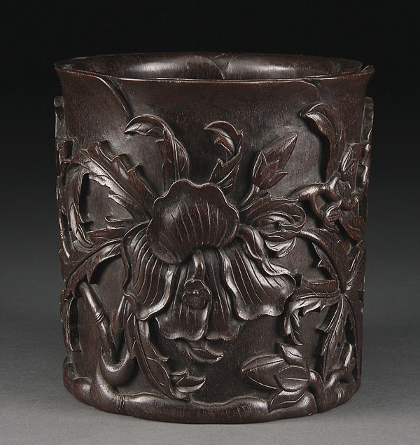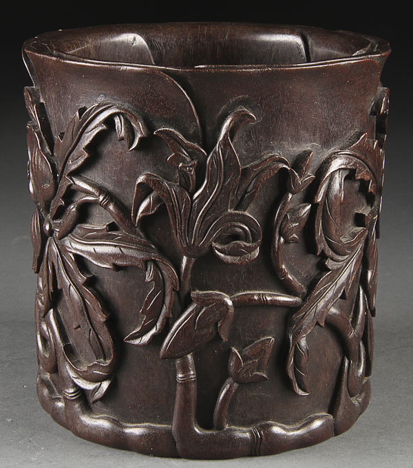 A GOOD CHINESE CARVED ZITAN WOOD "LOTUS" BRUSH POT, 19TH/20TH CENTURY. Very well carved in high relief with large blossoms and foliage. Height 6.375 inches (16 cm).