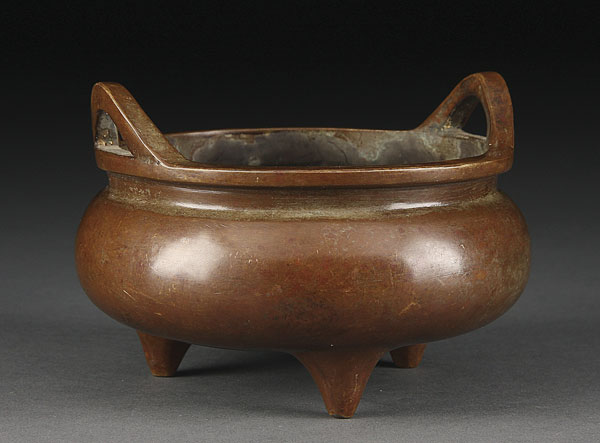 A CHINESE MING STYLE BRONZE CENSER. With two handles raised on tripod feet with embossed Zhengde seal mark. Diameter 5.25 inches (13 cm).