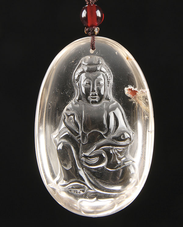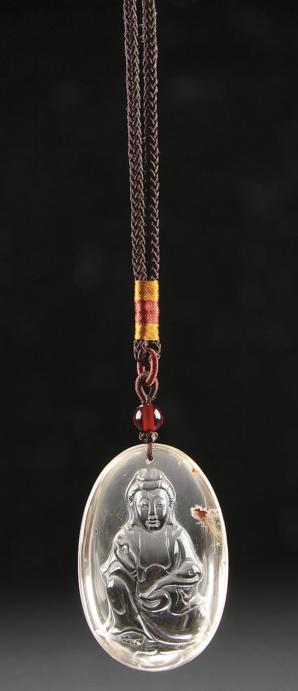 A FINE CHINESE CARVED CRYSTAL PENDANT, EARLY 20TH CENTURY. In the form of a seated Buddha. Length 2.5 inches (6.5 cm).