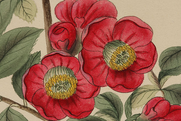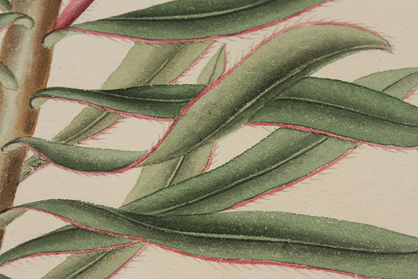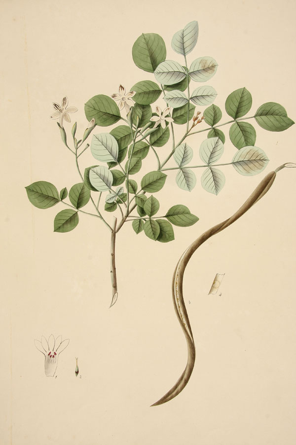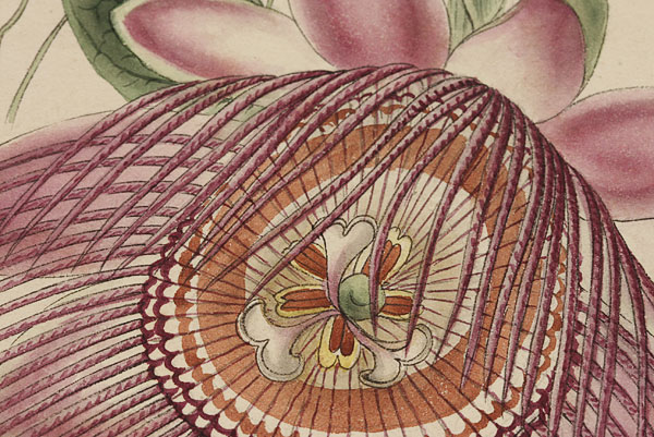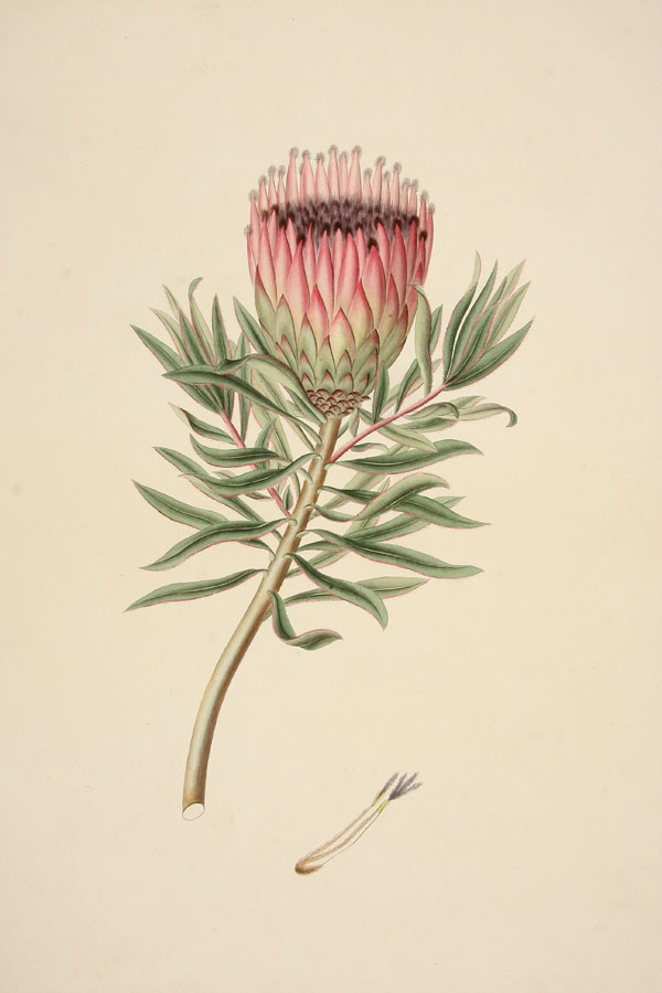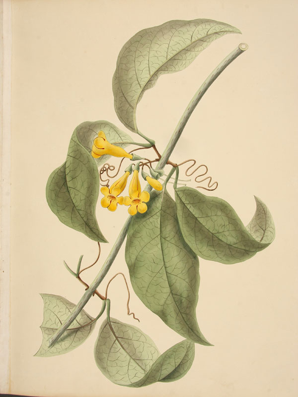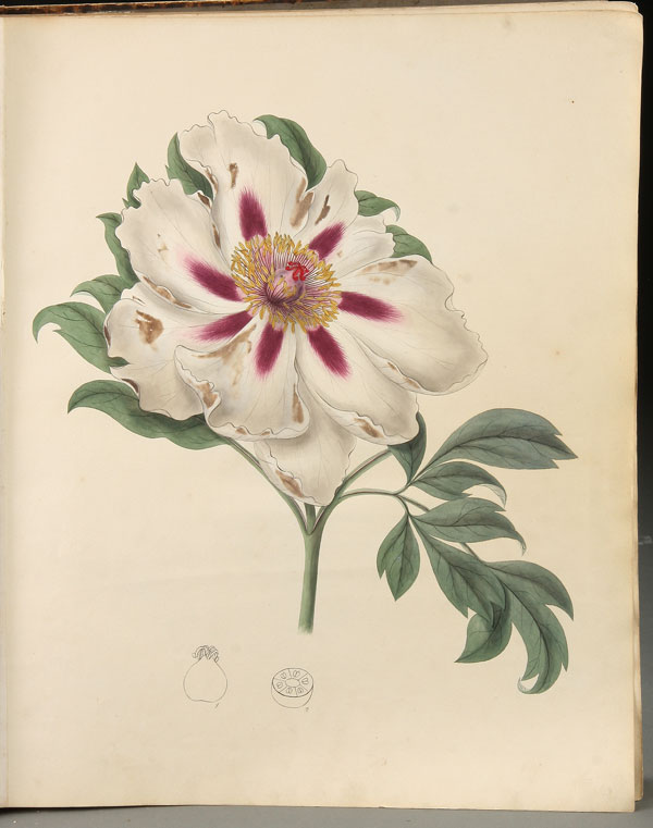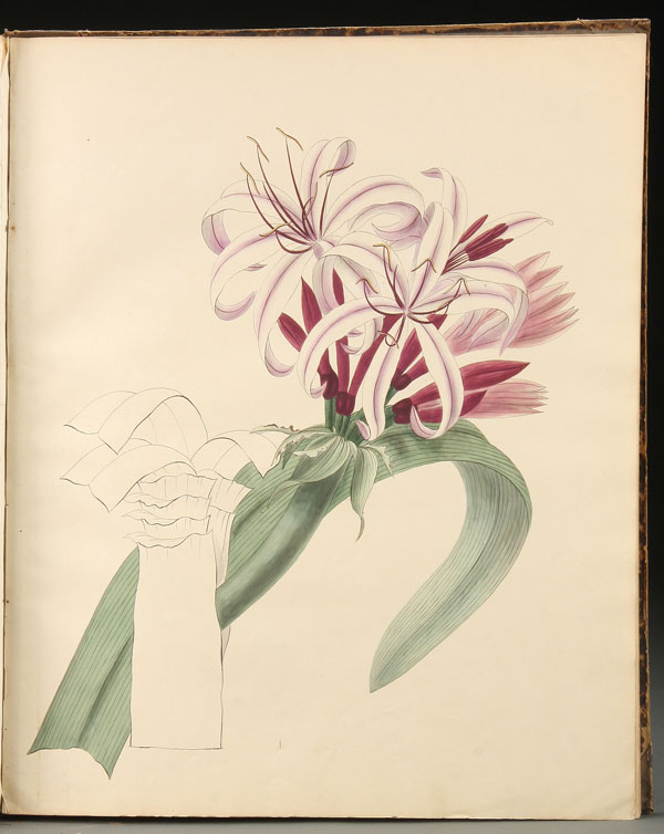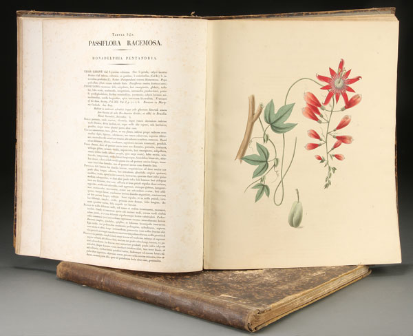 A COLLECTION OF ORIGINAL BOTANICAL WATERCOLORS ON PAPER, CIRCA 1800, POSSIBLY ANGLO-INDIAN SCHOOL. Comprising 73 hand painted watercolor studies of various species of wildflowers, the majority native to Africa and the India subcontinent, each painting tipped in, (three on "J. Whatman 1801" watermarked paper, and four on "Ruse and Turner 1805" watermarked paper, two with partial "J. Whatman" watermarks and the remainder apparently unmarked), and each facing a separate letterset and printed "Tabula" (table) describing the scientific name of each flower, the various classifications and references to other botanical books of the period. One volume with "Tabula" numbered 526-575 with 37 paintings, the other with 37 paintings. Together with two loose paintings removed for display. Each volume bound with faux tortoise shell paper, covered paste boards and devoid of any cover sheets or publishing information. Possibly for William Roxburgh, Calcutta, India. Each 20.75 inches x 17 inches (52.5 x 43.5 cm).