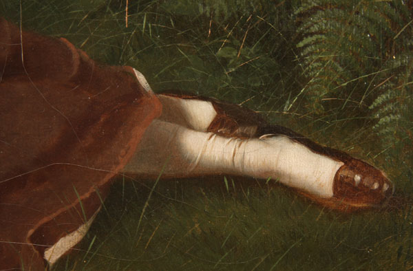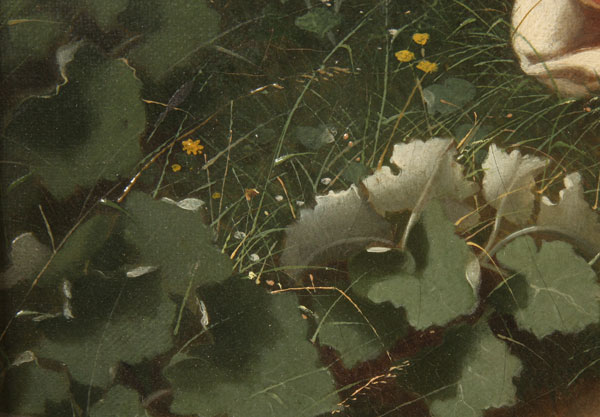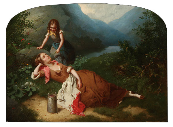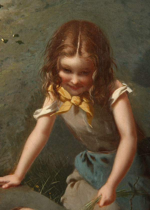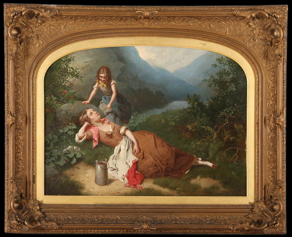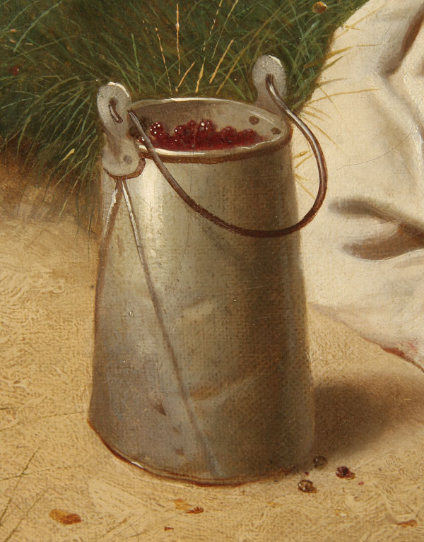 William Edward Millner was known primarily as a painter of rustic genre scenes and animals, especially horses. He lived all his life in Gainsborough, Lincolnshire (East Midlands). His father, who had the same forenames and who died in 1870, was also a local artist and teacher exhibiting two pictures at the British Institution in 1845. Millner exhibited eleven pictures at the Royal Academy between 1869 and 1896 (the last posthumously). Nearly all were genre scenes inspired by the day-to-day life of the Lincolnshire farming community as well as scenes related to his proximity to the North Sea. He is represented in the Tate by a single picture, A Wayside Gossip, dated 1872, and there are a number of paintings at the Gainsborough Old Hall Museum in his native town. The present work, which depicts a mother resting after gathering berries whilst her daughter tickles her nose with a sprig of grass, is delicately handled and sensitive in feeling and light, clearly exhibiting Pre-Raphaelite influence.