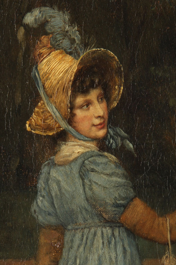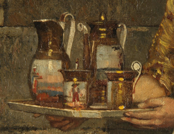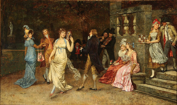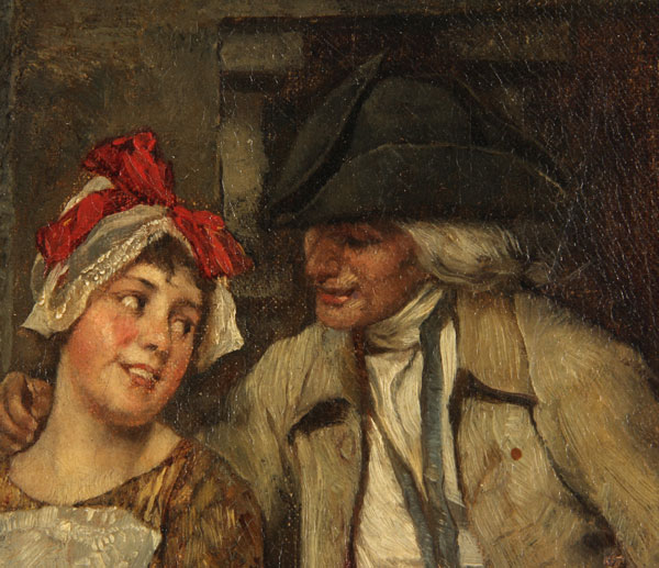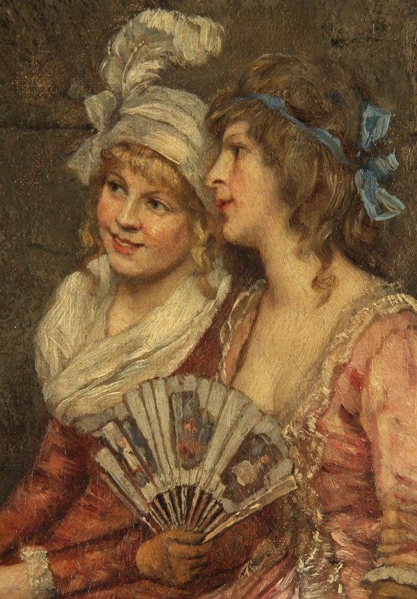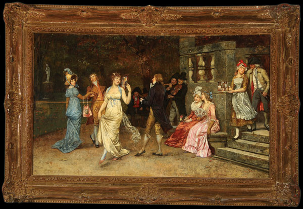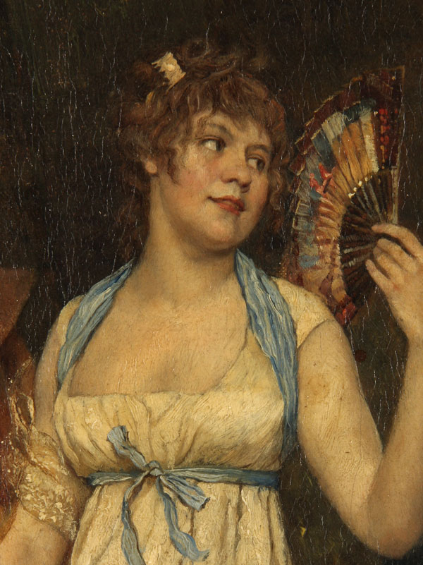 Rudolf Hirth du Frênes was an accomplished painter whose training began at the art school in Nuremberg and culminated at the Munich Academy. In the year 1869, while studying in Munich, he, along with artists Wilhelm Leibl, Johann Sperl and Theodor Alt, set up a group studio which came to be known as the Leibl-Kreis (Leibl Circle). There, they continued to explore realism accentuated by Gustave Courbet who stayed with the group while exhibiting his works in Munich. Du Frênes debuted at his first Salon around 1870, exhibiting in Vienna, Berlin and Munich. From around 1880-1885, he traveled and painted in Holland, Belgium, and France, eventually returning to Munich. His body of work covered a wide variety of subjects including landscapes, genre and portraits. The offered lot, Belle of the Ball, is an excellent example of du Frênes’s virtuosity both as a technically gifted painter and storyteller. At left center, the belle of the ball coquettishly shields her face with a fan while dancing with an admirer who himself is being admired by the two young women seated at mid-right awaiting their turn. Behind the belle, another young woman takes in the scene while her dance partner only has eyes for her. At far right, the young maidservant descending the steps with refreshments has herself drawn the attention of a tipsy admirer with bottle in hand. In the background, cast in the shadows, are the older generations who provide music for the affair and, further back still, reminisce about similar nights from their youth. Contrasted with the background, which speaks of fading memories and old age, the forefront, cast in light reflecting the brilliant silk clothing and vibrant flesh tones, masterfully conveys the timeless allure of youth.