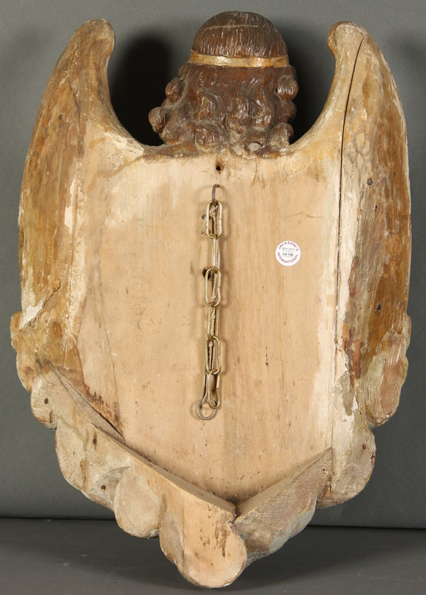 A CARVED WOOD ANGEL, GERMAN, 19TH CENTURY. A large and impressive carved, polychrome and gilt wood angel holding a chalice atop a cluster of clouds, carved in three-quarter round with good proportions, deep folds, cascading hair and feathering. Verso with suspension loop. Height 23.5 inches (59.6 cm), width 16.75 inches (42.5 cm).