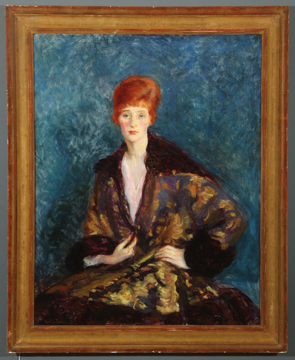 The sitter of this portrait looks remarkably similar to the wife of Ashcan artist Robert Henri with whom Ruth Hobbs studied. See Henri’s painting titled O in Black with Scarf, circa 1910, Fine Arts Museum of San Francisco. She is also quite similar to Bobbs’s painting titled Woman in White, also circa 1910, Indianapolis Museum of Art. The identity of that sitter is attributed to Jessica Penn, who later modeled for Henri, see Jessica Penn in Black with White Plumes, circa 1908, Crystal Bridges Museum of American Art, Arkansas. Ruth Pratt was born into a wealthy Indianapolis family and began taking art classes at age eight. In 1900, she went to Europe after the death of her parents. There, she studied art at the Academie Julian and three years later moved to New York and enrolled in the Arts Student League. In 1907, she returned to Indianapolis to continue studying at the John Herron Art Institute. By this time, Hobbs had studied with numerous well-known artists including William Merritt Chase and Robert Henri. In 1912, she married William C. Bobbs, president of the Bobbs-Merrill publishing company, and opened a studio where she gained a national reputation as an accomplished portraitist.