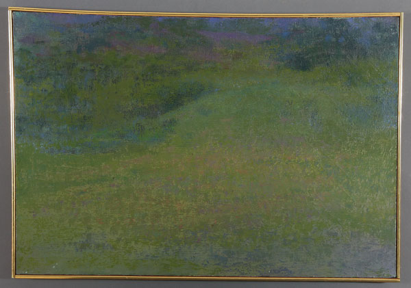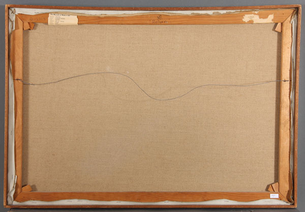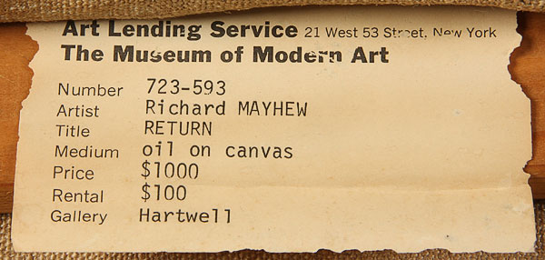 Verso with affixed label from “Art Lending Service – The Museum of Modern Art, 21 West 53 Street, New York, Number 723-593. Richard Mayhew – Return – Gallery: Hartwell.” Otherwise apparently unsigned.