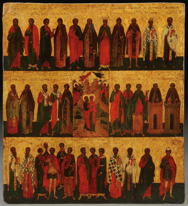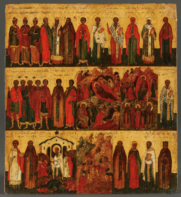A VERY FINE DOUBLE SIDED RUSSIAN ICON TABLETKA FOR THE MONTH OF DECEMBER, 16TH CENTURY, NOVGOROD SCHOOL. Both sides finely painted and depicting the saints or events celebrated on each day of the liturgical calendar for the month of December including the Nativity of the Lord, The Synaxis of the Mother of God, the 20,000 Martyrs of Nicomedia and the Massacre of the Innocents. Displayed in a museum quality free-standing Plexiglas case allowing viewing from both sides. 9.75 inches x 8.8 inches (25 cm x 22.5 cm).