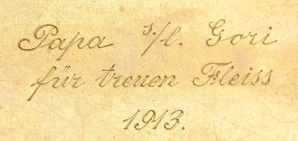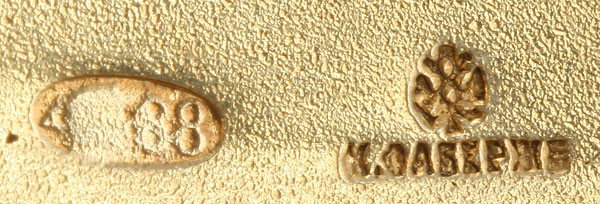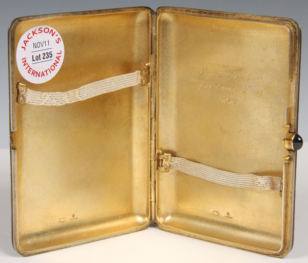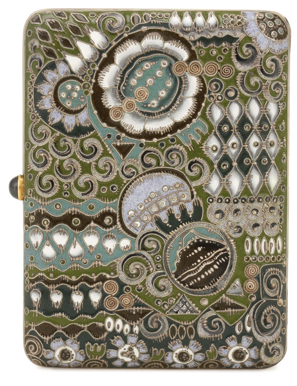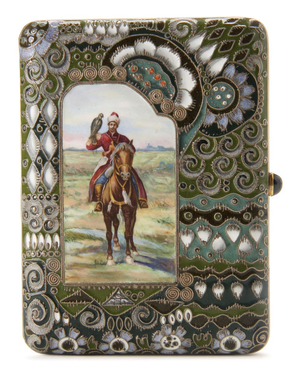 A VERY FINE FABERGE SILVER-GILT AND ENAMEL CIGARETTE CASE, MOSCOW, 1908-1917. Decorated in the Neo-Russian style on a moss green field, the hinged lid with matte en plein painted Tsar’s Falconer after Franz Rouband (Russian 1856-1928) and with blue cabochon thumbpiece. The interior gilded, and with 1913 dated dedicatory inscription. Hallmarked Moscow 1908-1917, stamped in Cyrillic K. FABERGE beneath the Imperial Warrant, 88 silver standard and scratched inventory number 35939. Length 4 inches (10.5 cm).