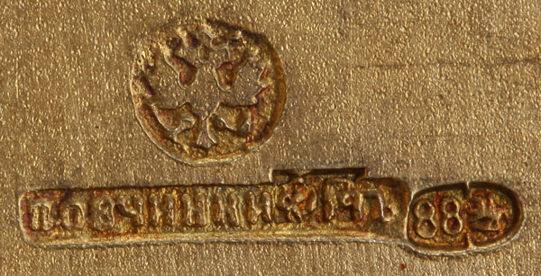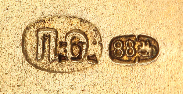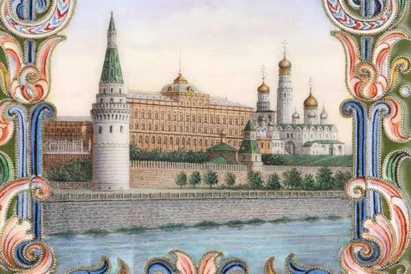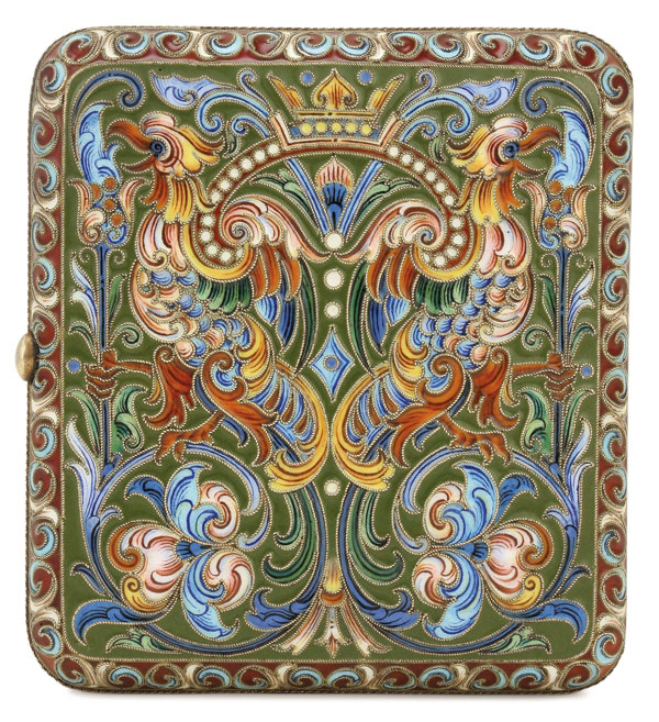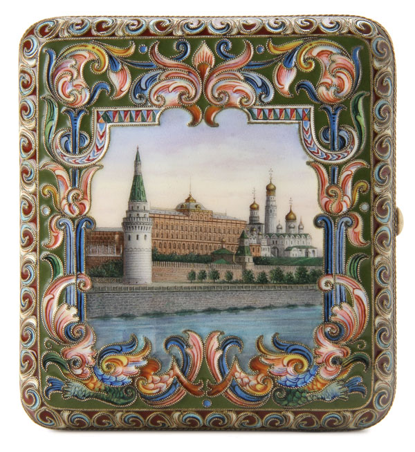 A VERY FINE RUSSIAN SILVER-GILT AND ENAMEL CIGARETTE CASE, FEODOR RUCKERT, MOSCOW, CIRCA 1900. The hinged lid with ornately framed cartouche masterfully painted en plein with a scene of the Moscow Kremlin. The remainder of the body overall in moss green enamel with colorful scrolling foliage and the reverse enameled with opposing exotic birds each holding a floral scepter. The interior brightly gilded, hallmarked Moscow c. 1900, stamped twice with the Cyrillic makers mark ФР for Feodor Ruckert, one over stamped with Cyrillic retailors mark of P. OVCHINNIKOV beneath the imperial warrant, and with 88 silver standard. Length 3.5 inches (9 cm).