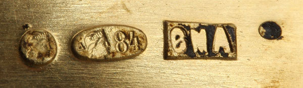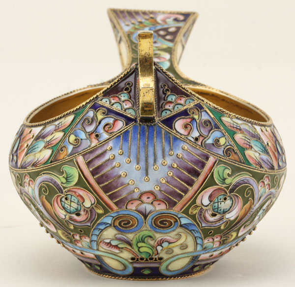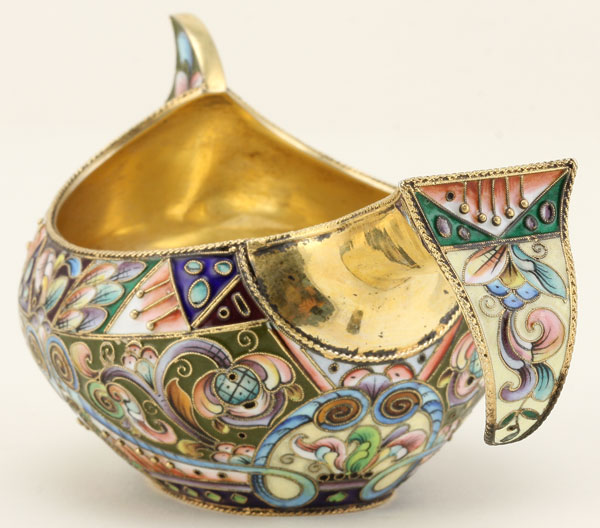 A VERY FINE RUSSIAN SILVER-GILT AND SHADED ENAMEL KOVSH, 6TH ARTEL, MOSCOW 1908-1917. The body overall enameled in the Neo-Russian style in pastel colors of scrolling foliage, geometrics and silver beading, the hook handle similarly decorated and the interior gilded. Hallmarked Moscow, 1908-1917, maker's mark of the 6th Artel (6MA) and with 84 silver standard. Length 5.3 inches (13.5 cm).