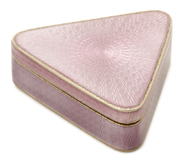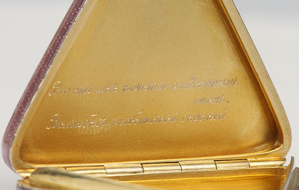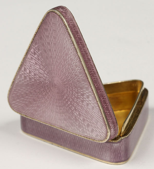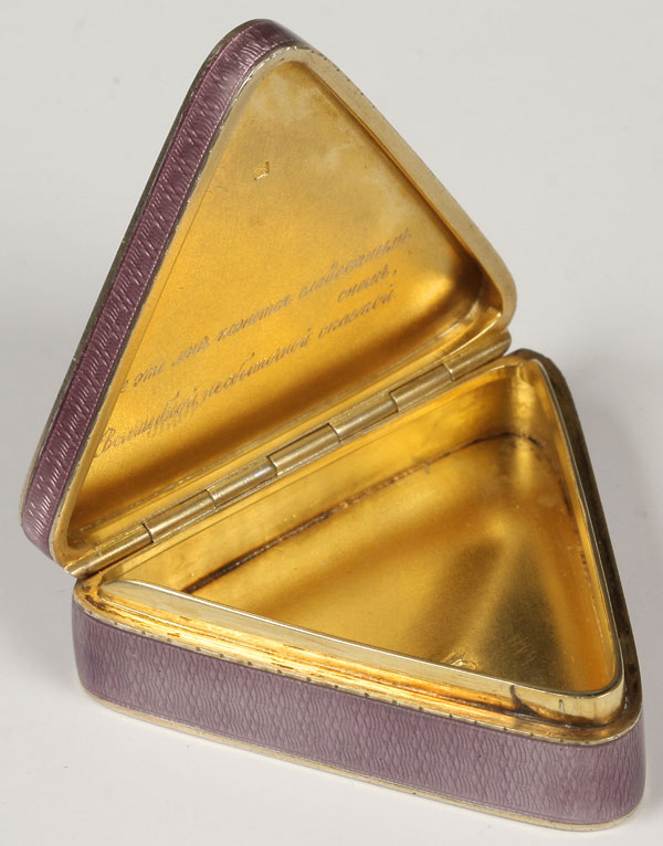 A FABERGE SILVER-GILT AND ENAMEL BOX, MICHAEL PERCHIN, ST. PETERSBURG, 1908-1917. Of triangular form, the sides and hinged lid with translucent lavender enamel over a radiating and wavy guilloche ground. The interior gilded and engraved in Russian with a line from the poem Cast Off the Boat, by Aleksei Nikolaevich Apukhtin, “All this seems to me a sweet dream, Magical elusive tale!” Hallmarked St. Petersburg, 1908-1917, Cyrillic mark М·П for head workmaster Michael Perchin, scratched inventory number 307 and with 88 silver standard. Length 1.65 inches (4.1 cm)
