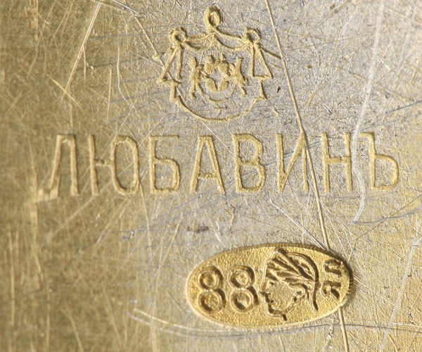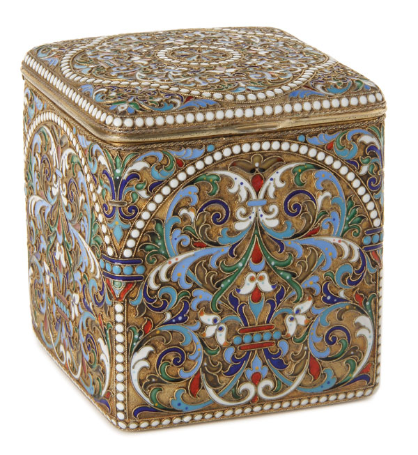A RUSSIAN SILVER-GILT AND CLOISONNE ENAMEL TEA CADDY, MOSCOW, 1899-1908. The side panels similarly enameled with scrolling foliage, strapwork and white beading on a stippled gilt ground. The hinged lid enameled with a quatrefoil medallion design of scrolling foliage and opening to reveal a brightly gilded interior hallmarked “Moscow 1899-1908”, stamped in Cyrillic, LUBAVIN under the Imperial warrant, and 88 silver standard. Height 3.25 inches (18.2 cm).