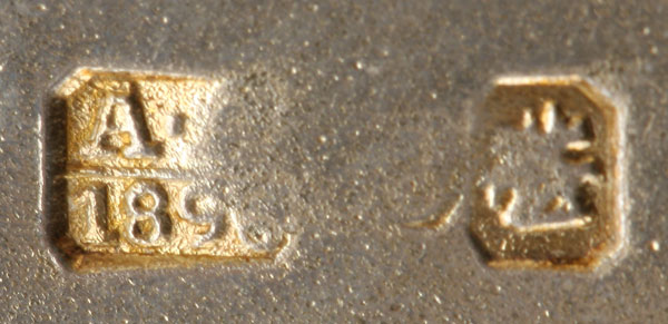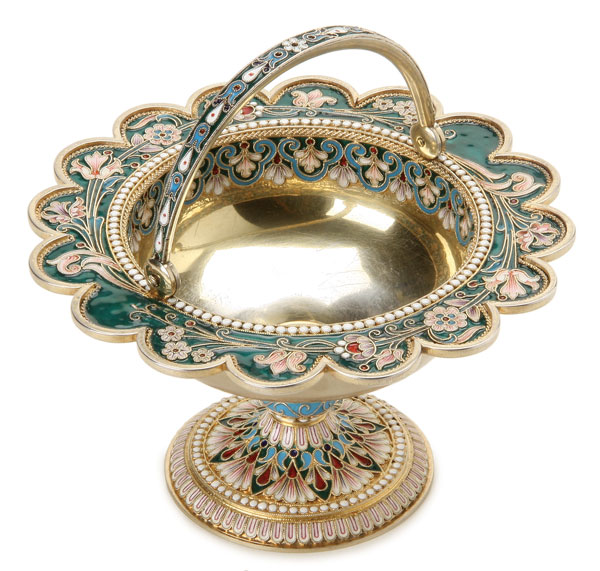 A LARGE AND IMPRESSIVE RUSSIAN SILVER-GILT AND SHADED ENAMELED BASKET, KURLYKOV, MOSCOW, 1896. Resting on a heavily enameled inverted conical base and supporting a large bowl with scalloped flared rim, enameled with florals and the interior banded with a repeating foliate design and the swivel handle enameled with bell flowers. Hallmarked Moscow, dated 1896, and stamped in Cyrillic O. KURLYKOV. Height 6 inches (15.2 cm).