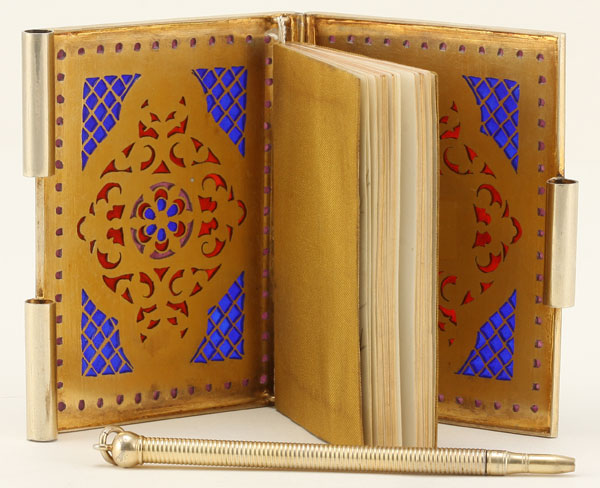 A FINE RUSSIAN SILVER-GILT AND PLIQUE-A-JOUR ENAMELED CARNET DE BAL NOTEPAD, MOSCOW, CIRCA 1890. The hinged covers with plique-a-jour enameled medallion centers banded with turquoise cloisonné beading and leaf tips. The interior opening to reveal the original mostly unused notebook backed in gold moiré silk and with original silver-gilt interlocking mechanical pencil. Hallmarked Moscow, 1890, maker’s mark AK- Antip Kuzmichev and with 88 silver standard. Length 5 inches (12.7 cm).