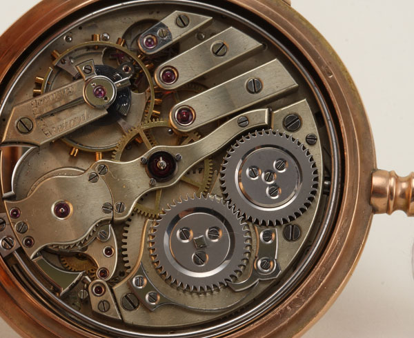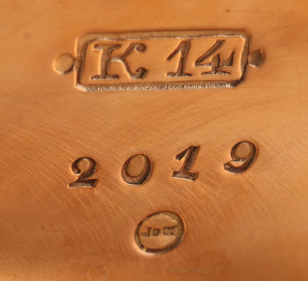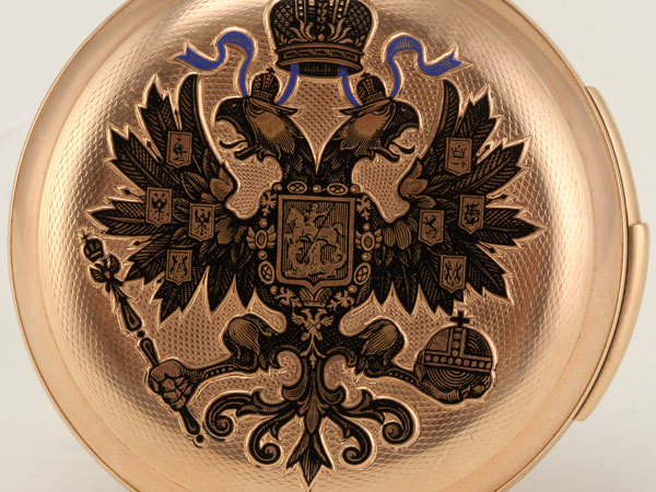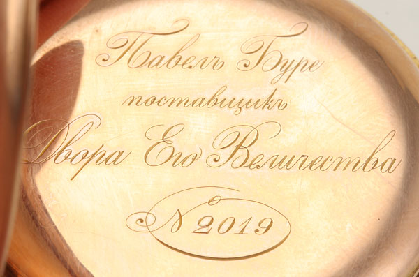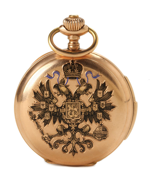 AN IMPERIAL RUSSIAN GOLD AND ENAMELED PRESENTATION POCKET WATCH, PAVEL BUHRE, CIRCA 1900.14kt gold hunting case, the front cover enameled with the Russian Imperial double headed eagle on an engine turned ground, white enamel dial with Roman numerals and subsidiary seconds dial. Inside of back cover engraved in Russian, "Pavel Buhre," stamped K14 and numbered 2019. Diameter 2 inches (5 cm).