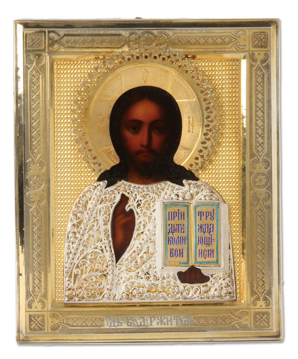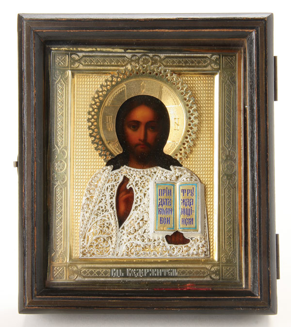 A RUSSIAN ICON OF THE LORD ALMIGHTY, MOSCOW, 1899-1908. Finely painted in the Italianate style, Christ delivers a blessing and holds an open book of gospels to Matthew 11:28. The entire image overlaid with a finely engraved gilded silver riza with filigree overlaying the garments and with enamel Gospel text. Hallmarked Moscow, 1899-1908, Cyrillic maker mark S.G. and 84 standard. Contained in a custom fitted glazed shadow box (kiot). Icon 5.25 inches x 4.3 inches (13 x 11 cm), overall with kiot, 6.5 inches x 5.5 inches (16 x 14 cm).
