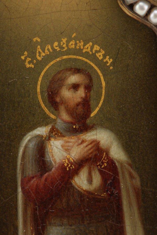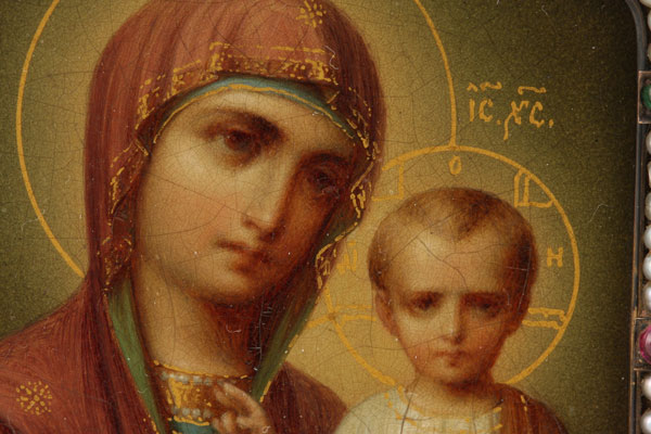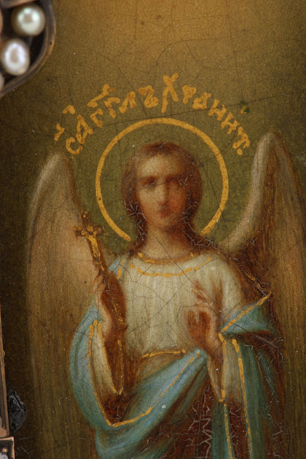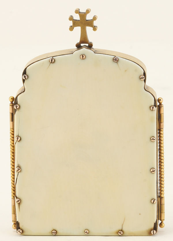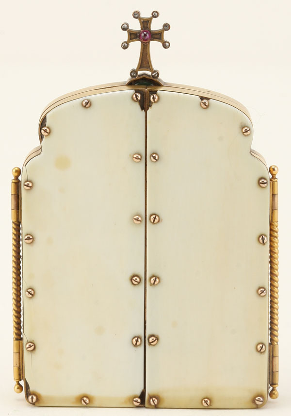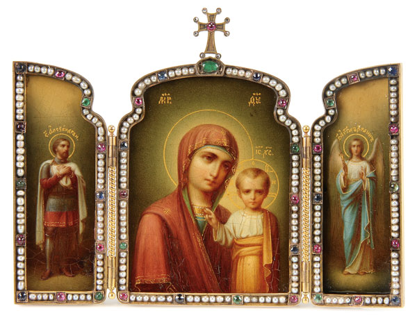 A VERY FINE FABERGE GOLD AND GEM SET ICON TRIPTYCH, ST. PETERSBURG, 1896-1908. Comprising three hinged frame panels in the Byzantine taste, the central panel finely painted with the Kazan Mother of God, the left wing with Saint Alexander Nevsky and the right wing with the Guardian Angel. The inner borders of each hinged shaped frame panels recessed and lined with seed pearls, cabochons and cut stones. The central panel set with a Byzantine cross final set with diamonds and a red cabochon. Verso overlaid with ivory panels. The frame Hallmarked St. Petersburg, 1896-1908, 56 gold standard (14K) stamped in Cyrillic FABERGE and with workmasters initials BA for Victor Aarne. Height 3.25 inches, width 4.3 inches (open) (8.6 cm x 11.1 cm).