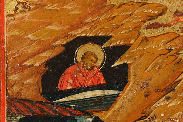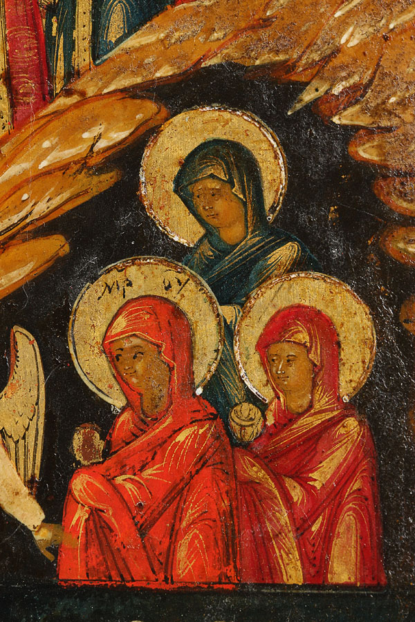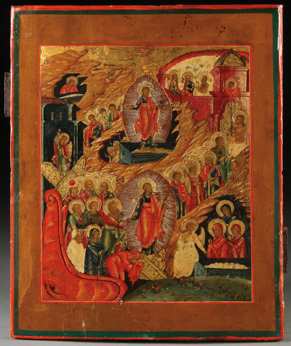A RUSSIAN ICON OF THE RESURRECTION AND DESCENT, CIRCA 1800, PROBABLY PALEKH. In this complex rendering, both the western depiction of Easter, the resurrected Christ standing above his empty tomb (top) and the traditional Eastern depiction of Easter is displayed as Christ Descends into Hades (below) to set forth from bondage the righteous men and women of the Old Covenant. Finely painted with characteristic Palekh details and pallet. 13.5 inches x 11 inches (34.5 x 28.2 cm).