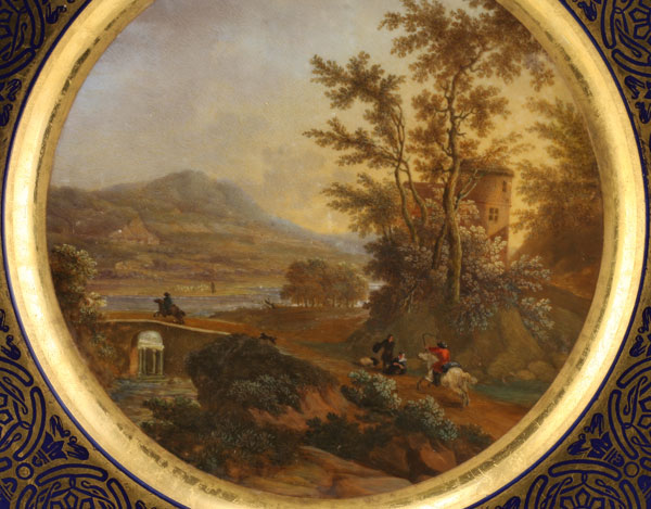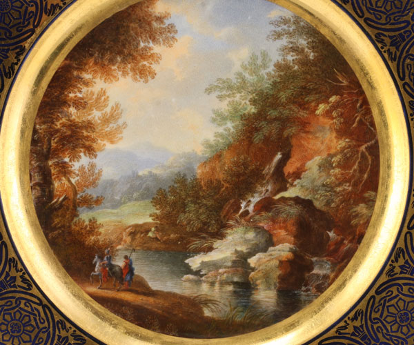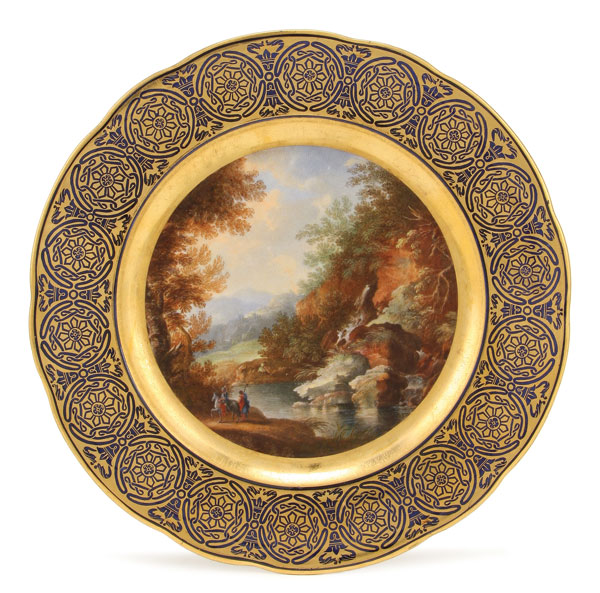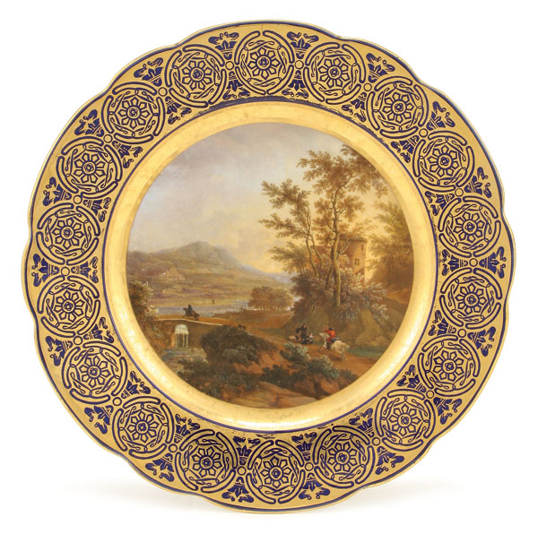 A FINE & RARE PAIR OF RUSSIAN IMPERIAL PORCELAIN FACTORY HAND PAINTED SCENIC PLATES, PERIOD OF NICHOLAS I. The cavetto of each plate finely painted in miniature with an expansive landscape and travelers. The border in cobalt blue with a repeating pattern of gilt medallions interspersed with bellflowers and the rim scalloped. Underside of one with the Imperial Cypher of Nicholas I. Diameter 9.75 inches (24.7 cm).
