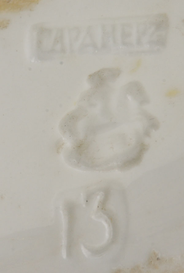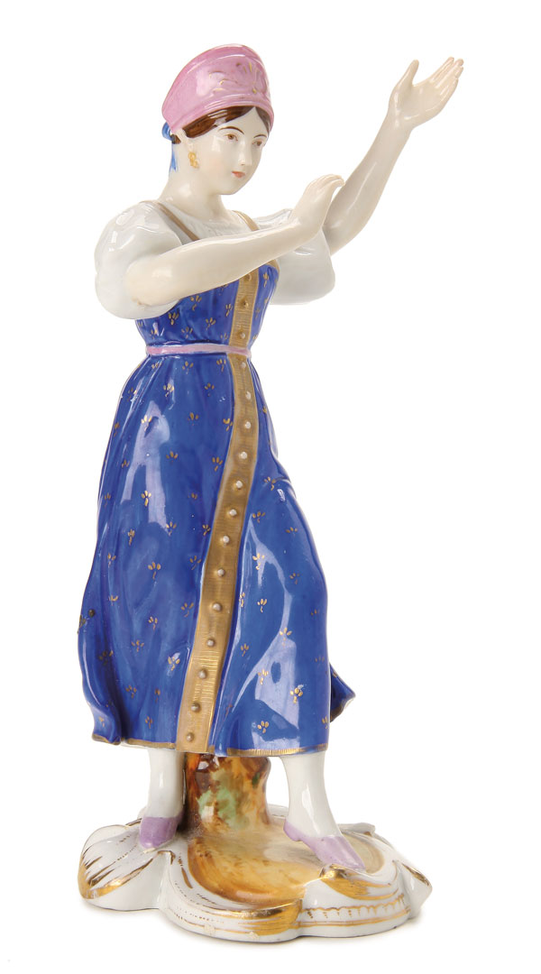 A RUSSIAN PORCELAIN FIGURE OF A DANCING WOMAN, GARDNER, Mid 19TH CENTURY. Finely modeled wearing a pink embroidered kokoshnik and with gilt highlights throughout. Impressed Gardner mark beneath St. George (Moscow). Height 8.25 inches (21 cm).