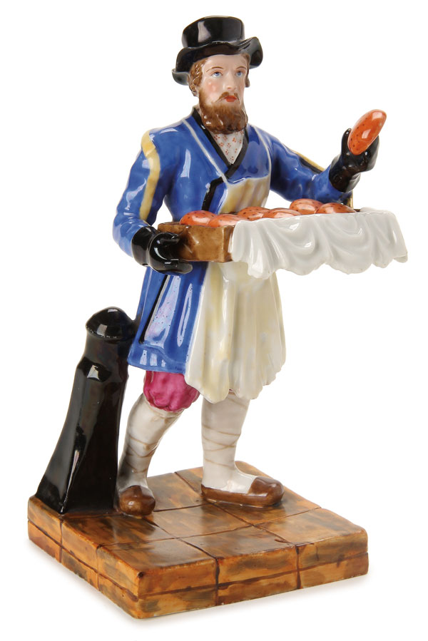 A FINE RUSSIAN PORCELAIN FIGURE OF A STREET VENDOR, KORNILOV, CIRCA 1875. Finely decorated, the underside with red Kornilov mark under the Imperial Warrant. Height 6.75 inches (17.2 cm).