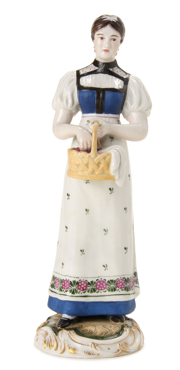 A RUSSIAN PORCELAIN FIGURE OF A GIRL WITH A BASKET OF BERRIES, GARDNER, Mid 19TH CENTURY. Impressed Gardner mark and Moscow (St. George). Height 8.125 inches (20.6 cm).