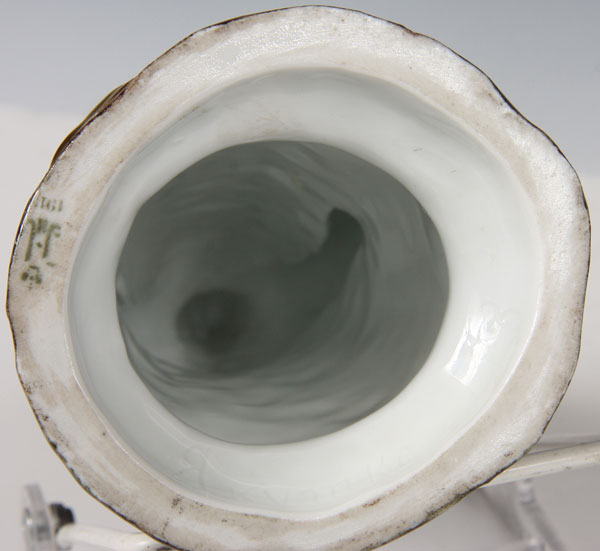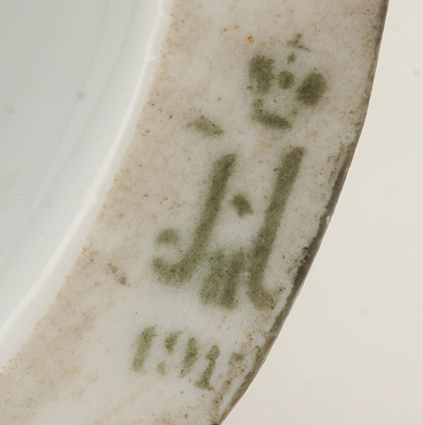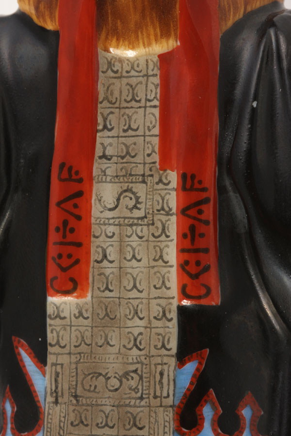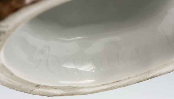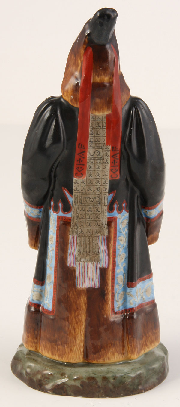 A RARE RUSSIAN IMPERIAL PORCELAIN FACTORY FIGURE OF A YAKUT WOMAN, PERIOD OF NICHOLAS II AND DATED 1911. Wearing a long fur-trimmed coat and hat with colorfully embroidered scarf on a naturalistic base. Underside incised in Cyrillic "Yakutka" and with modeler’s initials, and in green the Cypher of Nicholas II beneath a crown and dated 1911. Height 7.8 inches (20 cm).