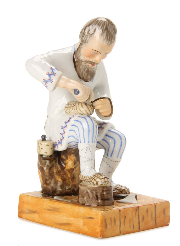A RUSSIAN PORCELAIN FIGURE OF A PEASANT MAKING LAPTI, MIKLASHEVSKY FACTORY, 19TH CENTURY. Underside with red factory mark. Height 6.5 inches (16.5 cm).