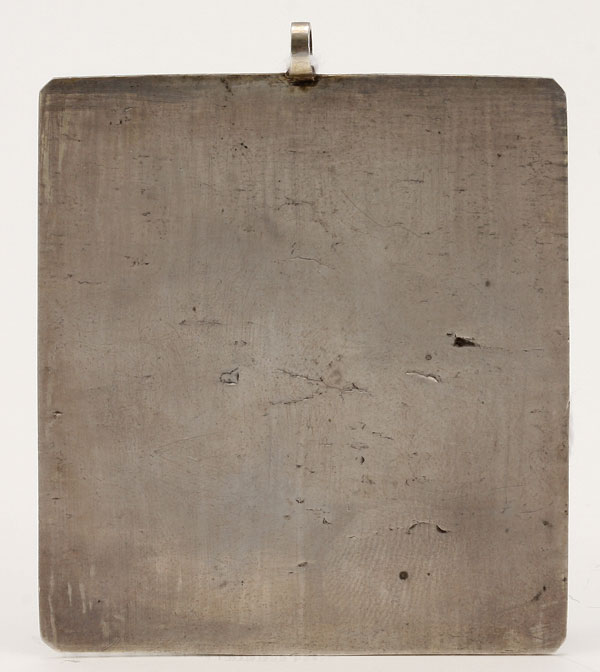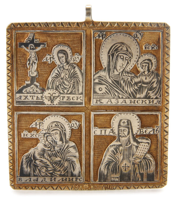 A FINE RUSSIAN SILVER-GILT, NIELLO & ENGRAVED FOUR PART ICON PENDANT, MOSCOW, 1843. Clockwise from upper left the images depicted are: The Akhtuirskaya Mother of God, the Kazan Mother of God, The Venerable Paul (probably the monastic Paul of Komelsky) and the Vladimir Mother of God. Hallmarked Moscow, dated 1843 and assay mark of Andre Kovalskii. 2.75 inches x 2.25 inches (7 cm x 5.7 cm).