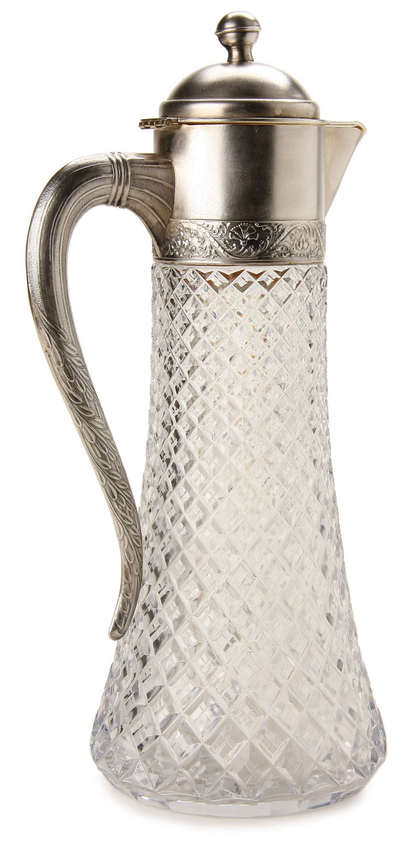 A FINE SILVER-MOUNTED CUT GLASS CLARET JUG, AFTER 1917.Stamped with silver standard 875 and with indistinguishable maker’s mark, probably Soviet period. Height 13 inches (33 cm).