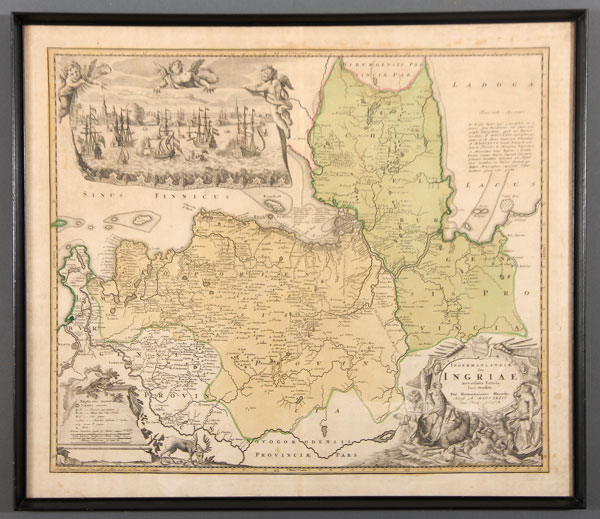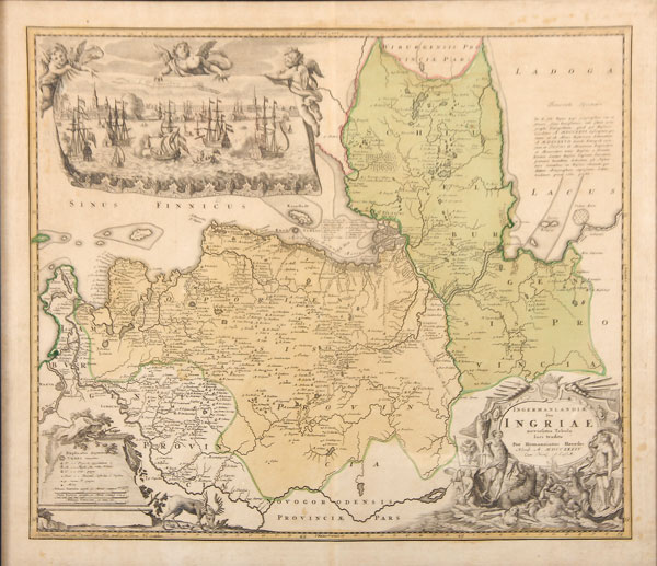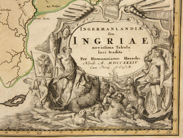 AN EARLY 18TH CENTURY MAP OF ST. PETERSBURG, 1734. Ingermanlandiae Seu Ingriae Nivissima Tabula Luci Tradita, Per Homannianos Heredes, MDCCXXXIV. [Nuremberg), 1734. Hand colored and printed on laid paper, engraved by Alexei Rostovtsev and first published in 1727 for Ivan Kirilov’s Atlas of the Russian Empire, dedicated to Tsar Peter II. The upper left corner with a vignette of St. Petersburg with Naval Ships and the Peter and Paul Fortress in the background and illustrating St. Petersburg and her environs. 18.5 inches x 21.75 inches (47 x 55 cm), sheet 20.75 inches x 24 inches (52.5 x 61 cm).